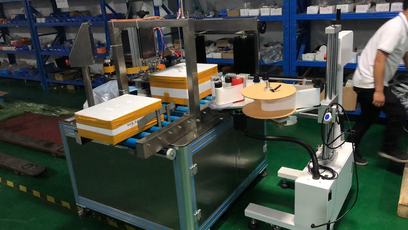 机器已在客户现场调试完毕。该机器替代了人工封箱和贴标!