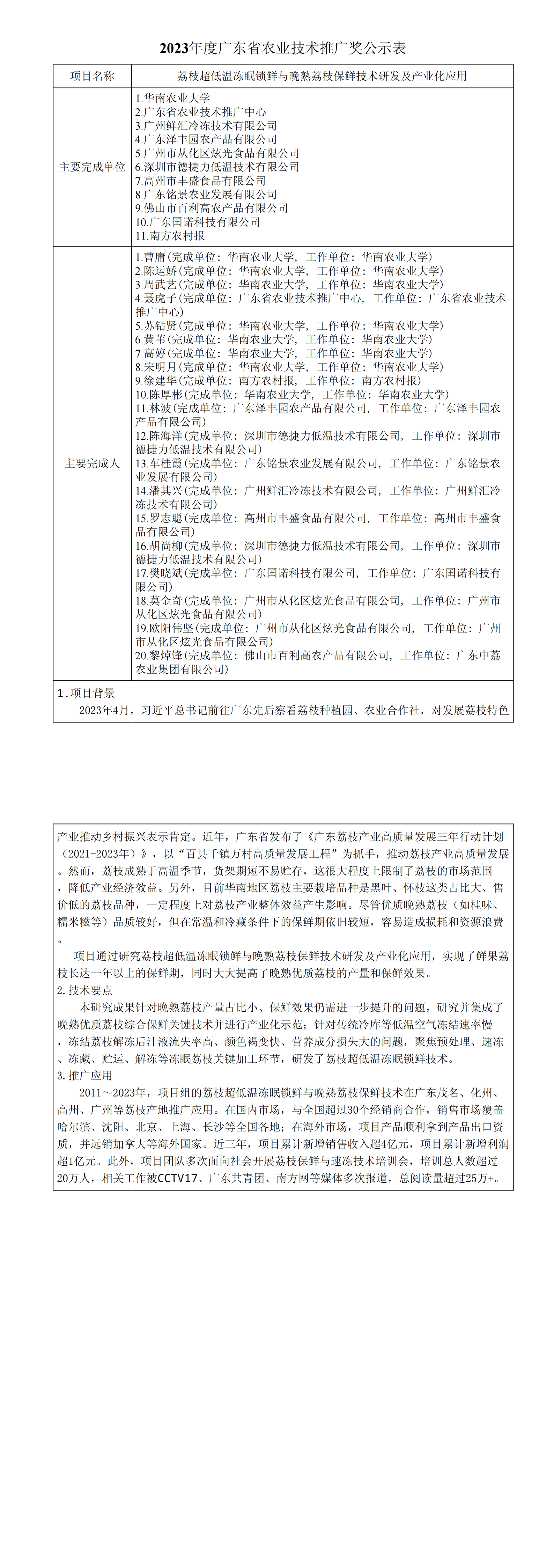 根据 《关于申报2023年广东省农业技术推广奖的通知》要求,我单位 单位 人员 参与申报了 现将2023年广东省农业技术推广奖项目相关内容进行公示(具体内容见下图)。